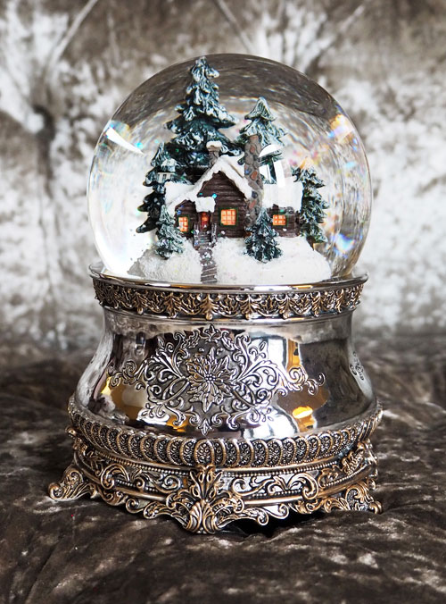 Luxusní vánoční koule s krásným jakoby tepaným stříbrným podstavcem a manuálním hracím strojkem.