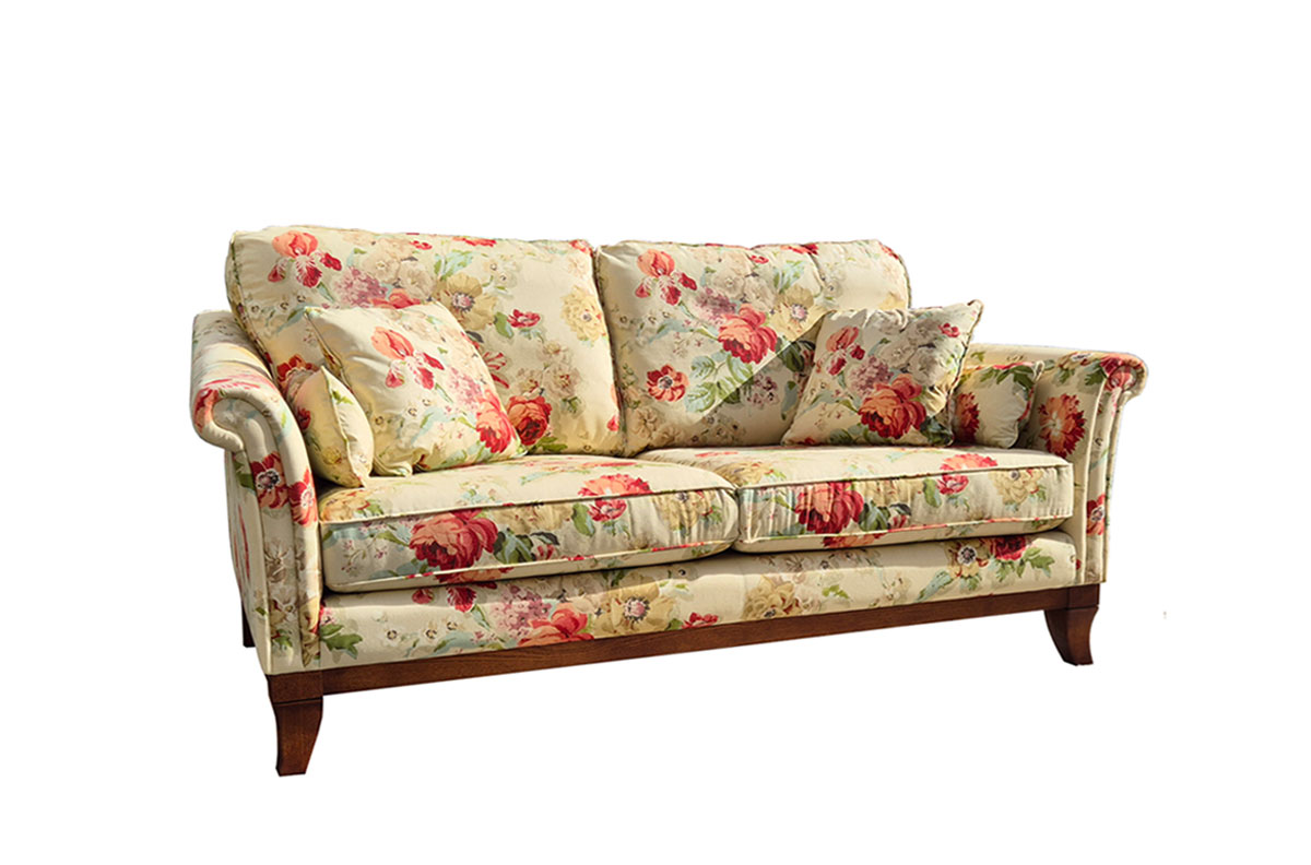 Naše sedací souprava květinový vzor vyrábíme z prvotřídních, ručně vybíraných masivních dřevěných kusů, které lepíme a spojujeme ocelovými prvky v nadstandardně pevnou kostru. Ta je právě základem celé sedací soupravy a je dále doplněna o kovové pružiny. Právě kovové pružiny zaručují dlouhou životnost a stálost sezení. Výplňové materiály splňují přísné evropské normy a požadavky. Vše dotváří jedinečná potahová látka, která svým vzorem okouzlí každého milovníka krásných interiérů, a to nejen v anglickém stylu. Kouzlo této pohovky spočívá v celkovém provedení a vzhledu. Sedací souprava s květinovým vzorem působí v interiéru soliterním dojmem
