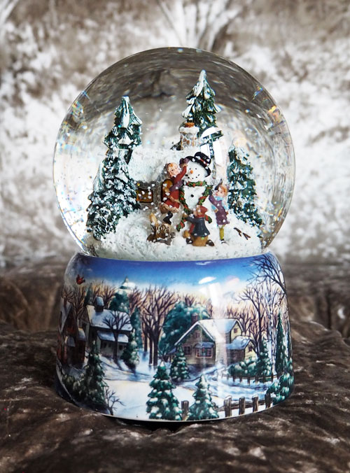 Sněžící koule s motivem sněhuláka a hrajících dětí. Součástí je i natahovací hrací strojek.
