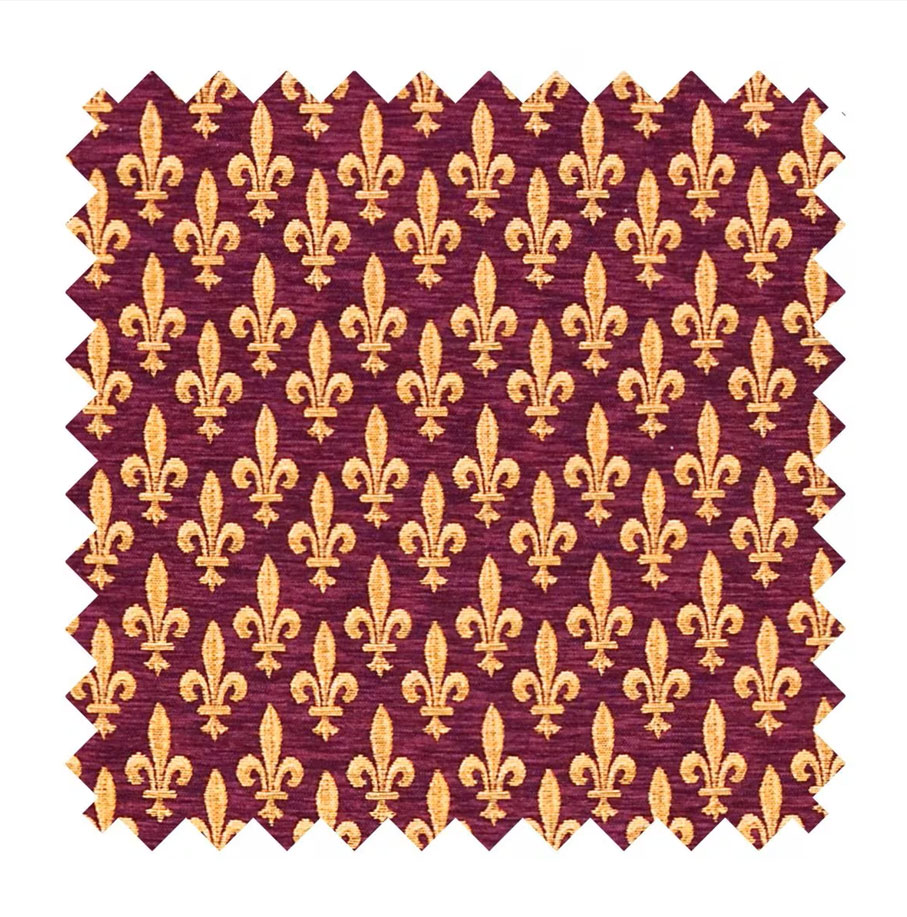 Tato elegantní gobelínová látka Fleur de Lys v bohatém burgundském odstínu je tkaná z měkkého bavlněného chenillu a zdobena ikonickým heraldickým motivem lilie. Vzor „Fleur de Lys“ se používá po staletí jako symbol královské důstojnosti a patří mezi nejoblíbenější emblémy ve znacích a heraldických dekoracích.
